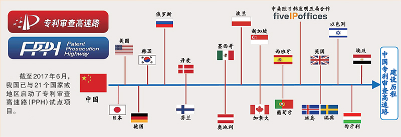 5年來,國家知識產權局從我國企業的現實需要出發,積極開展相關工作。為了幫助我國企業在海外提交專利申請,加快專利獲權,截至2017年6月,國家知識產權局先后與21個國家或地區的專利審查機構簽訂了專利審查高速路(PPH)協議,PPH合作網絡已具規模,為中國企業“走出去”,更好維護海外知識產權利益提供了便利。