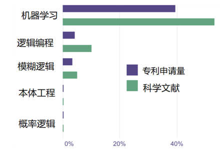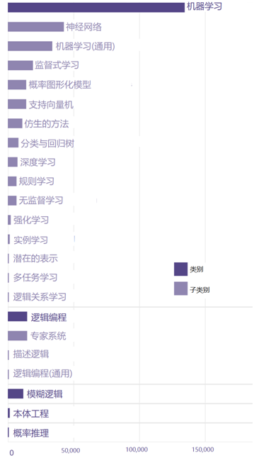 在科學(xué)文獻(xiàn)方面,截止到2018年中期,全球共發(fā)表了1050631篇關(guān)于機(jī)器學(xué)習(xí)的文章,占AI文獻(xiàn)總量的64%。AI中的機(jī)器學(xué)習(xí)是全球研究者最主要的研究領(lǐng)域,其次是邏輯編程和模糊邏輯(見圖3)。