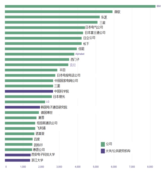 在AI專利申請(qǐng)量全球排名前30名的申請(qǐng)人中,有26名是公司,其主要涉及電子消費(fèi)、電信、電力公用事業(yè)和汽車制造等行業(yè),另外4名是大學(xué)和科研機(jī)構(gòu)。全球申請(qǐng)AI專利最多的公司是IBM,共8290件,其次是微軟(5930件)。在AI專利申請(qǐng)量排名前20的公司中,日本有12家,美國(guó)有3家,中國(guó)有2家。在AI專利申請(qǐng)量排名前500的申請(qǐng)人中,中國(guó)的大學(xué)和科研機(jī)構(gòu)占到了五分之一。