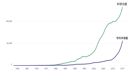 圖1 1962-2017年全球AI專利申請(qǐng)量和科學(xué)文獻(xiàn)數(shù)量的變化趨勢(shì)
