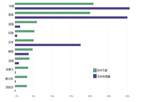 圖8:部分國(guó)家專利申請(qǐng)量和科學(xué)文獻(xiàn)申請(qǐng)量的所占比例