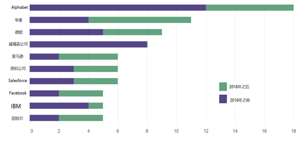 自1998年以來,共有434家AI領(lǐng)域的公司被收購(gòu),其中2016年以來的收購(gòu)占到總數(shù)的53%。AI領(lǐng)域被收購(gòu)的公司絕大多數(shù)是美國(guó)公司(共283家公司被收購(gòu)),Alphabet、蘋果和微軟是最活躍的收購(gòu)實(shí)體(見圖9)。絕大多數(shù)被收購(gòu)的公司都是初創(chuàng)公司(平均年齡3歲),在被收購(gòu)的公司中,絕大多數(shù)(79家信息披露的公司中有53家)專門從事機(jī)器學(xué)習(xí)技術(shù)的研發(fā)。