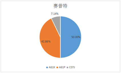 賽普特醫藥在“一帶一路”國家發布醫藥行業專利數量為28件。在專利申請的IPC分類中,數量最多的是A61K,占申請總數的50%,其次是A61P類,占比約為42.86%,然后是C07J(甾族化合物),占比為7.14%(見圖12)。從賽普特醫藥的IPC分類來看,其專利申請類別只有三類,其中以普通醫藥用品和化合物或藥物制劑為主要的申請對象。