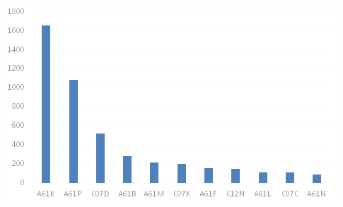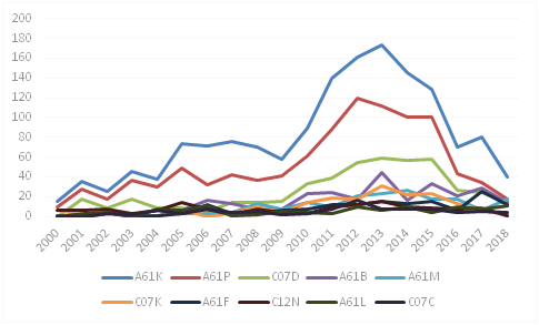 在技術申請趨勢方面,數據統計從2000年至2018年的專利發布情況,從數據統計情況來看(見圖3),A61K(醫用、牙科用或梳妝用的配制品)、A61P(化合物或藥物制劑的特定治療活性)、A61M(將介質輸入人體內或輸到人體上的器械)、C07K(肽)、C12N(微生物或酶;其組合物)、C07C(無環或碳環化合物)在2000年之前已經有專利發布,其中最多的A61K在2000年發布的專利數量為15件,其次是A61P,數量為10件。從2000年至2018年的專利發布趨勢來看,大部分的專利類別從2009年左右開始大幅增長,其中A61K、A61P、C07D的增長趨勢最明顯;A61K從2013年開始,專利發布數量大幅下降,一直到2017年有小幅的回升,2018年繼續下滑;而A61P從2012年開始小幅下降,2015年下降幅度較大;C07D從2009年至2015年是逐漸遞增,增速較為均勻,2015至2016年數量明顯下滑。