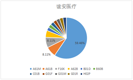 誼安醫療在“一帶一路”國家發布醫藥行業專利數量為39件。在專利申請的IPC分類中,數量最多的是A61M(將介質輸入人體內或輸到人體上的器械;為轉移人體介質或為從人體內取出介質的器械;用于產生或結束睡眠或昏迷的器械),占申請總數的59.46%,其次是A61B(診斷;外科;鑒定)類和F16K(閥;龍頭;旋塞;致動浮子;通風或充氣裝置),占比均為8.11%(見圖11)。從誼安醫療的IPC分類來看,其專利涉及的主要領域為醫療器械類。