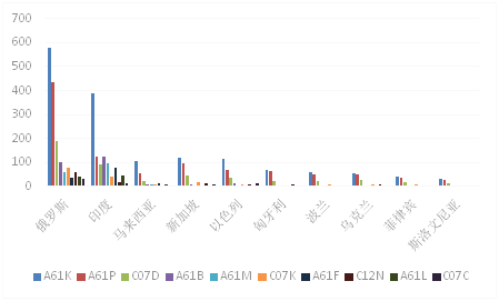 從在“一帶一路”國家發布專利的技術構成來看,A61K是數量最多的分類,多數集中在俄羅斯和印度,A61P類的專利發布數量最多的地區是俄羅斯,其次是印度、新加坡和以色列,C07D的發布地區多位于俄羅斯、印度和新加坡(見圖5)。