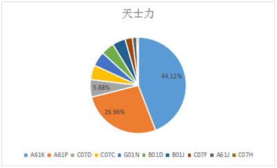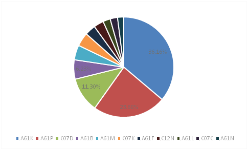 天津天士力是在“一帶一路”國家發布醫藥行業專利數量位居第二的企業,總件數為89件,數量與排在首位的恒瑞醫藥不相上下。在專利申請的IPC分類中,數量最多的是A61K,占申請總數的44.12%,其次是A61P類,占比約為26.96%,排在第三位的是C07D,占比為5.88%(見圖7)。從天士力的IPC分類來看,醫藥用品類專利依舊是數量最多的分類,接近總數的1/2,而化合物或藥物制劑是其另一重點專利類別。
