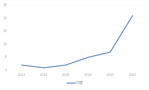 先健科技從2013年開始在印度有專利布局,布局時間較晚,專利發布數量逐年遞增,從2017年到2018年間的專利申請數量劇烈增長,在2018年數量高達21件。先健科技在“一帶一路”國家的專利布局較為單一,僅僅局限于印度(見圖19)。