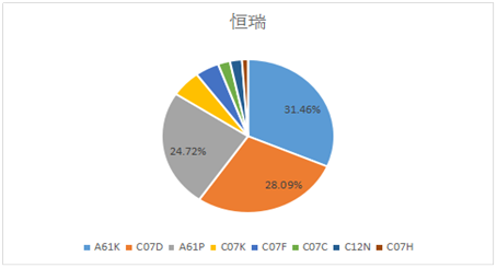 江蘇恒瑞醫藥是在“一帶一路”國家發布專利數量最多的企業,總件數為92件,在專利申請的IPC分類中,數量最多的是A61K,占申請總數的31.46%,其次是C07D類,占比約為28.09%,排在第三位的是A61P,占比為24.72%(見圖6)。從恒瑞醫藥的IPC分類來看,醫藥用品類專利占據總數的1/3左右,而高分子化合物類是其申請的另一重點專利類別,而A61K和C07D的占比較為接近,由此可見恒瑞醫藥的科研創新性較好。