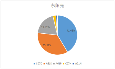 東陽光藥業在“一帶一路”國家發布醫藥行業專利數量為80件。在專利申請的IPC分類中,數量最多的是C07D,占申請總數的41.46%,其次是A61K類,占比約為35.37%,然后是A61P,占比為19.51%(見圖9)。從東陽光藥業的IPC分類來看,其專利申請類別也較為集中,一共涉及5個分類,而其數量最多的類別是雜環化合物和化合物或藥物制劑類,其專利創新性較高,技術水平較佳。