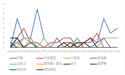通過以上中國醫藥行業在“一帶一路”國家專利申請趨勢的分析來看,專利的申請沒有太大的規律可循,但明顯可見在2015年之前,專利的主要布局國家為俄羅斯,2015年之后為印度。