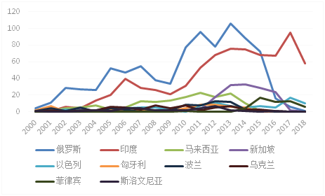 如圖4所示,從中國醫藥行業專利申請數量最多的俄羅斯和印度的情況來看,兩者的申請趨勢較為相似。從2000年至2009年逐漸緩慢上升,從2009年開始,兩者的增幅明顯擴大,俄羅斯的申請數量在2012年至2013年間小幅下滑,在2014年激增后直線下滑,而印度在2013年至2015年有逐漸下滑的趨勢,但隨后在2017年反彈;在馬來西亞的專利發布多集中于2005年至2015年間,而新加坡從2011年開始,專利申請數量大幅增加。
