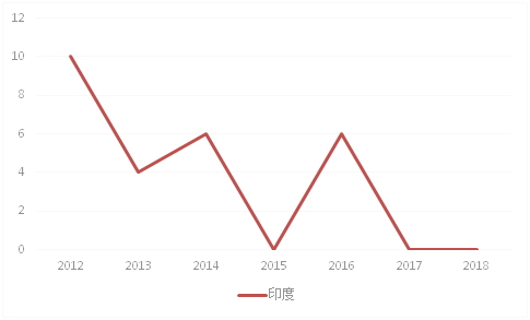 恒瑞醫藥的專利布局國家范圍很廣泛,涉及10多個“一帶一路”國家,這些國家在南亞和東歐地區居多,其中印度、烏克蘭、匈牙利是其主要申請國家。恒瑞醫藥的專利申請呈現階段性的申請特征,即不同時間段在不通過的國家有申請,在2012年在塞爾維亞、2014年在馬來西亞和匈牙利、2015年在塞浦路斯而2016年在菲律賓。在印度申請專利的數量近些年有所下降,高峰區間位于2010年至2014年間(見圖15)。恒瑞醫藥在2008年開始在“一帶一路”國家有專利布局。