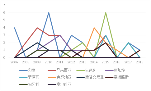 和黃醫藥在“一帶一路”國家的專利申請涉及國家10多個,分布廣泛,多位于南亞和中東歐地區,從2006年開始,有專利布局于“一帶一路”國家。在印度的專利申請數量最多的是2010年,為6件,幾乎每年在印度都會有專利申請;2008年至2014年是和黃醫藥在馬來西亞申請專利的集中時間區間;在以色列的專利申請在2015年最多,為6件;在新加坡的專利申請在2009到2015年為高峰階段。從和黃醫藥的申請國家趨勢來看,在中東歐地區的專利申請時間早于在南亞專利申請時間,中東歐國家的專利申請高峰階段多位于2009年至2012年間,而在南亞國家的申請高峰區為2013年之后(見圖17)。