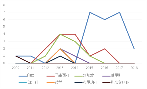 從東陽光藥業的國家專利申請趨勢來看,主要申請國家為8個,多數位于南亞和中東歐地區。東陽光藥業大約在2009年開始在“一帶一路”國家有專利布局。在印度申請的專利數量從2015年之后達到高峰階段,數量最多的是2015年和2017年,為7件;在馬來西亞的專利申請則集中于2012年至2016年間;新加坡與馬來西亞的情況類似;在其他國家的申請情況基本為在某一年有專利申請,其余時間并未有專利申請(見圖18)。