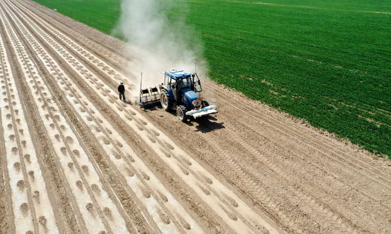在新疆生產建設兵團第六師共青團農場,一臺安裝北斗導航自動駕駛系統的播種機在播種棉花(2020年4月8日攝,無人機照片)。新華社發(李華北 攝)