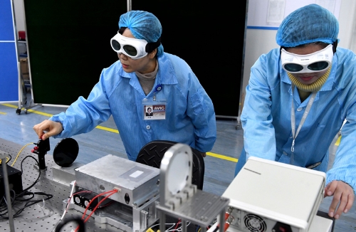 2月25日,在中國航空工業集團公司洛陽電光設備研究所,航空工業集團光電專業特級技術專家羊毅(左)與團隊成員在實驗室做實驗。新華社記者 李安 攝