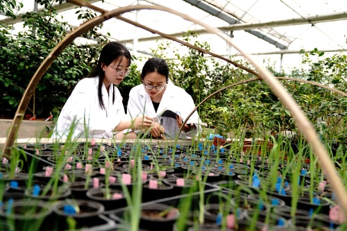 上海植物園科研人員程琳(左)、張蕾蕾在溫室觀察記錄花菖蒲新品種生長情況(2020年6月5日攝)。新華社記者 張建松 攝