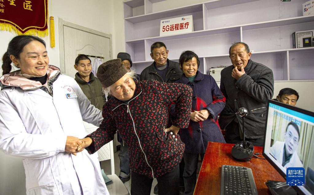 安徽省金寨縣大灣村村民方臨芳(前左二)指著自己身體疼痛的部位,在村醫袁玲(左一)的幫助下向5G遠程醫療會診的專家講述病情(2020年12月3日攝)。新華社發(陳力 攝)