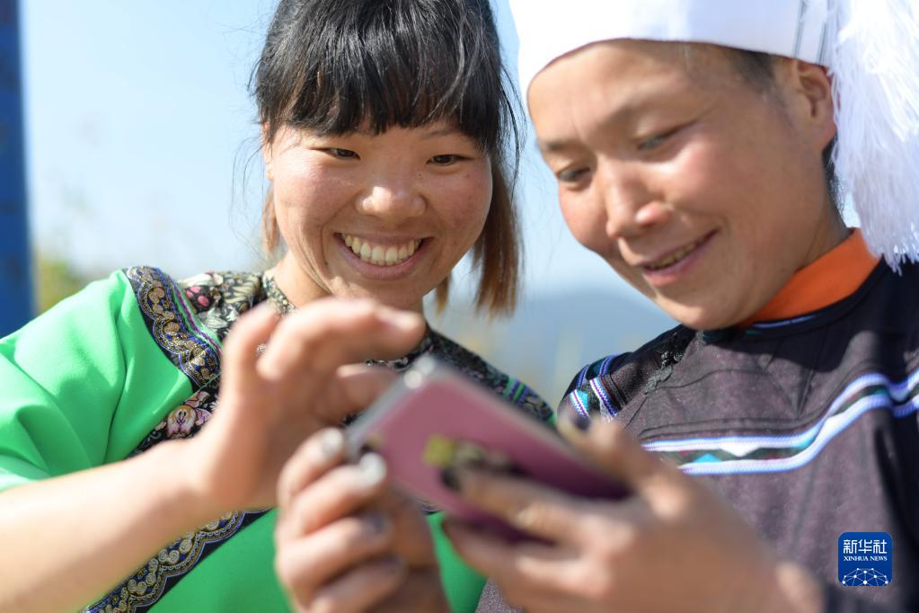 在貴州省黔東南苗族侗族自治州榕江縣水尾水族鄉拉術村,一位村民(右)在學習使用手機(2020年10月24日攝)。新華社記者 楊楹 攝