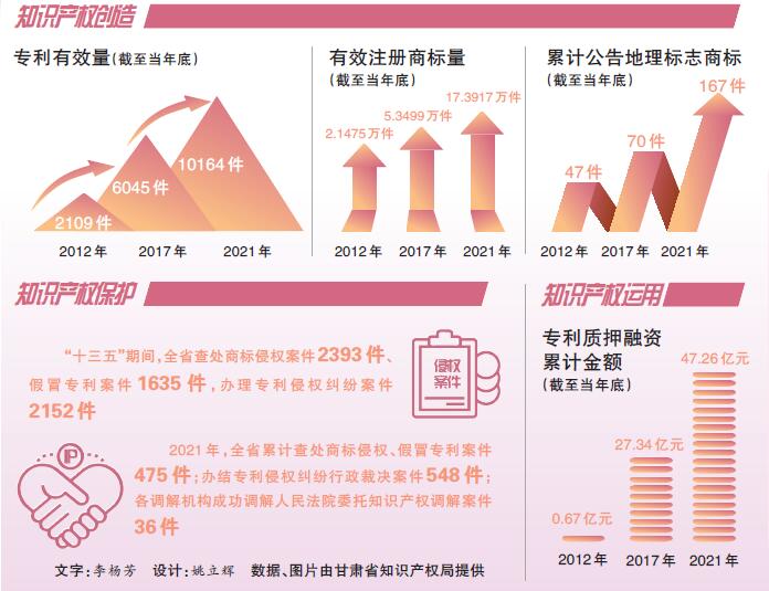 黨的十八大以來,甘肅省搶抓新時代推進西部大開發(fā)形成新格局和“一帶一路”建設(shè)的關(guān)鍵機遇期,厚植知識產(chǎn)權(quán)制度優(yōu)勢,錨定“上量、進位,出特色、有突破,叫得響、立得住”的發(fā)展思路,為幸福美好新甘肅和富民興隴新局面的建設(shè)積蓄起蓬勃的知識產(chǎn)權(quán)能量。