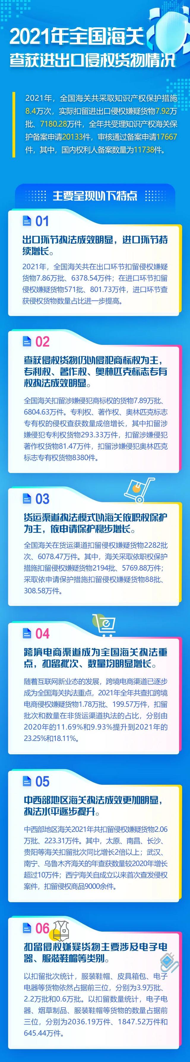 保持打擊進出口侵權商品高壓態勢。2021年,海關總署連續第5年部署開展“龍騰行動”,全國海關持續聚焦群眾反映強烈、社會輿論關注、侵權假冒多發的重點商品,尤其對進出口關乎生命健康、威脅公眾安全的侵權商品的行為實施重拳打擊。上海、南京、寧波等海關扣留侵權糖果、番茄醬、飲料等198.9萬件,堅決守護消費者“舌尖上的安全”;廈門、汕頭、昆明等海關加強對“貼身”產品的知識產權保護力度,扣留侵權衛生巾、洗發水、化妝棉等個人護理用品582.2萬件;天津、拉薩等海關重點關注兒童用品安全,扣留侵權童裝、童車、玩具等近90萬件;杭州、青島、黃埔等海關開展假冒汽車零配件專項執法,扣留侵權發動機零件、濾清器、雨刷等58.8萬余件。