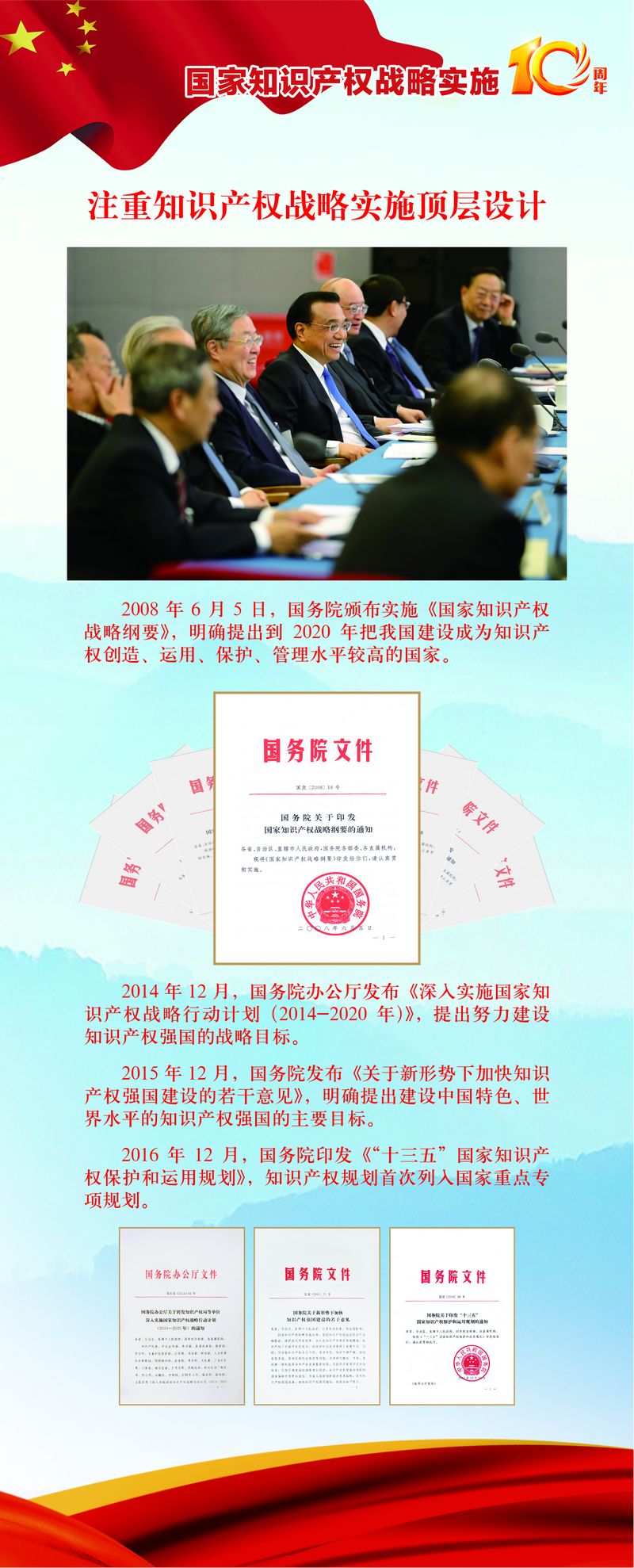 6月5日 國務院發布《國家知識產權戰略綱要》,確定到2020年,把我國建設成為知識產權創造、運用、保護和管理水平較高的國家。