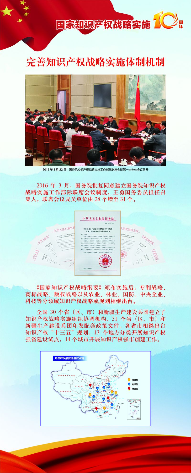 2008年6月5日,國務院頒布實施《國家知識產權戰略綱要》,將知識產權工作上升到國家戰略層面進行統籌部署和整體推進,為知識產權事業發展指出了明確方向。同年10月9日,國務院批復同意成立國家知識產權戰略實施工作部際聯席會議,統籌協調國家知識產權戰略實施工作。聯席會議由28個成員單位組成,辦公室設在國家知識產權局。
